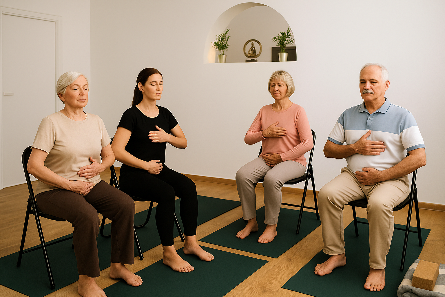 - Yoga adaptado en silla: pensado para personas con movilidad reducida, edad avanzada o dolencias crónicas (fibromialgia, dolor lumbar, cervicalgias, hernias discales).