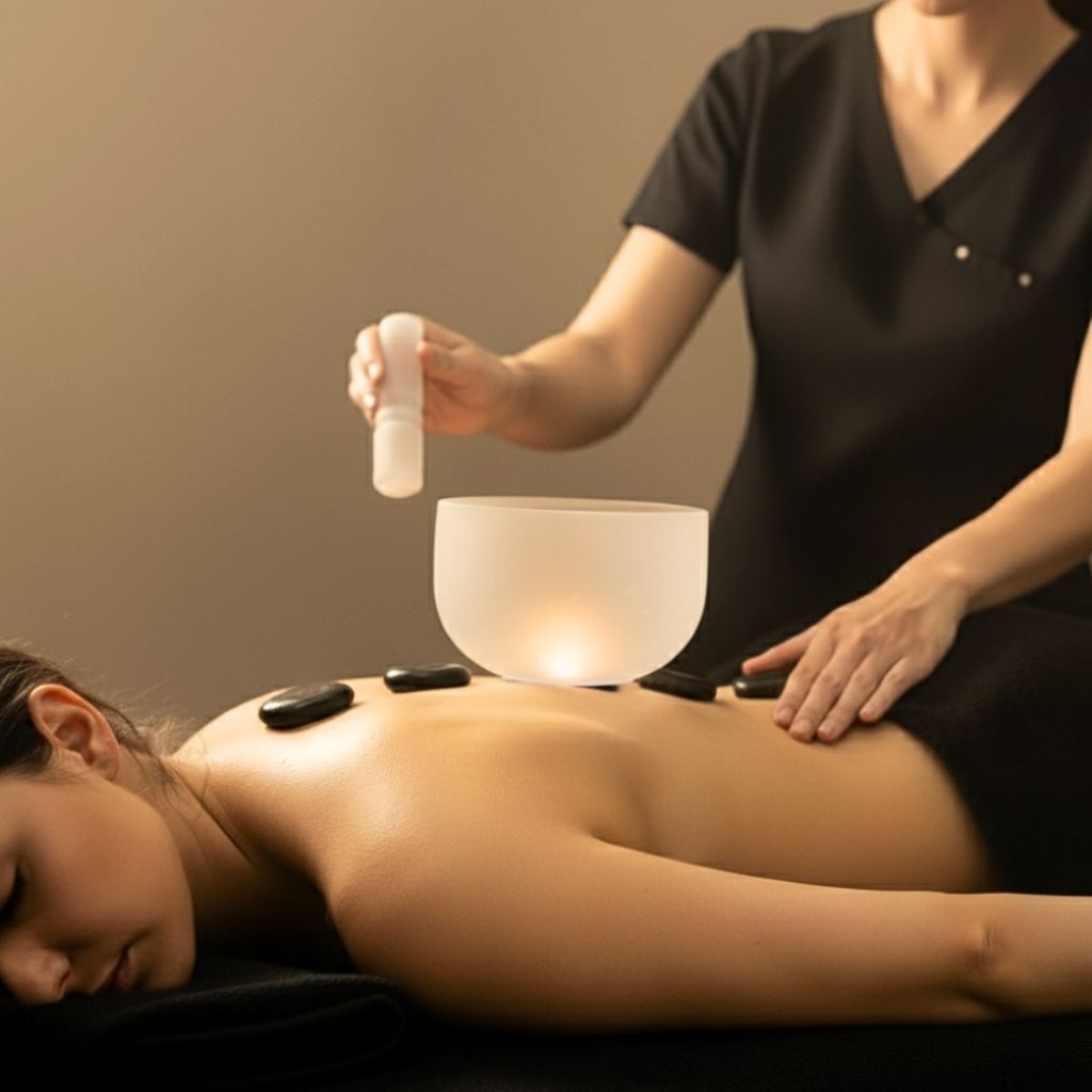 Armoniza cuerpo, mente y respiración con aceites esenciales, cuencos terapéuticos y piedras térmicas. Un ritual que induce paz, silencio interior y conexión con tu esencia.